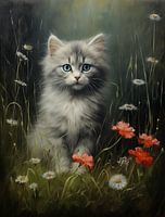 Deze aandoenlijke afbeelding toont een jonge, pluizige grijs-witte kitten met grote, stralende blauwe ogen, rustig zittend te midden van een veld vol delicate bloemen. De kitten lijkt bijna sprookjesachtig met zijn zachte, volumineuze vacht en nieuwsgierige blik die de kijker direct aankijkt. De rode en witte bloemen om haar heen voegen…