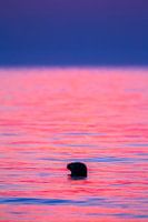 Grijze Zeehond in het water met alleen de kop zichtbaar. Reflectie met veel kleur van de ondergaande zon op de wolken. Let op, beeld kan korrelig zijn door hoge ISO.