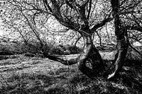 Krom groeiende boom in duingebied Meijendel bij Den Haag. Geef de natuur vrij spel en geniet van de vormen. afbeelding is gemaakt in zwart wit met veel contrast en structuur.