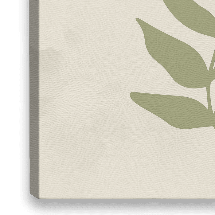 Minimalistische illustratie van een stijlvolle stengel met bladeren in groen op een natuurwitte, licht getextureerde achtergrond.