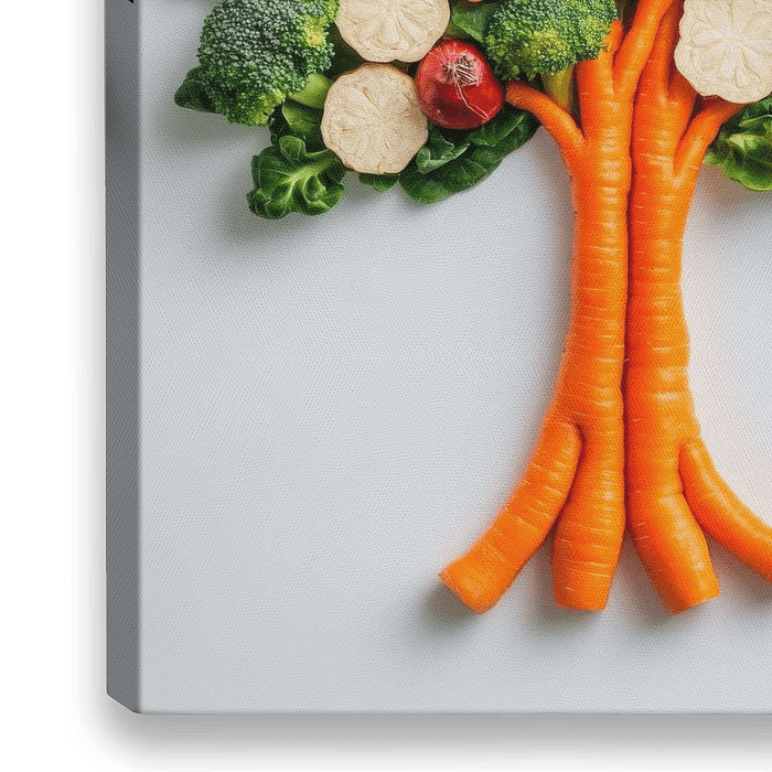 Een levendige moestuin ontvouwt zich in de vorm van een prachtige boom, met knapperige broccolitakken en heldere wortelwortels in het middelpunt. De kleurrijke bloemen van verse bieten en pompoenvruchten geven het geheel een vrolijk tintje. Dit kunstwerk is ideaal voor in de keuken en nodigt uit tot gezonde gerechten en gezellig koken.