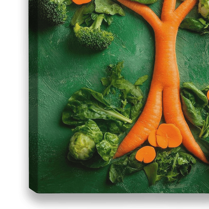 Een levendige groenteboom ontvouwt zijn kleurrijke fruit en gebladerte op een rustieke achtergrond. Heldere appels en levendige wortels dansen harmonieus met groene broccoli en delicate komkommerschijfjes. Deze creatieve compositie brengt frisse energie en gezondheid in elke keuken en inspireert tot koken en smullen. Ideaal voor een…