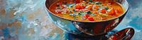 Groentesoep Schotel - Dit levendige kunstwerk presenteert een smakelijke groentesoep in een glanzende kom, uitgelicht door expressieve penseelstreken en een rijk palet aan warme kleuren. De compositie speelt met reflecties en lichtval, wat een dynamisch en uitnodigend tafereel creëert, terwijl de textuur de visuele zintuigen…