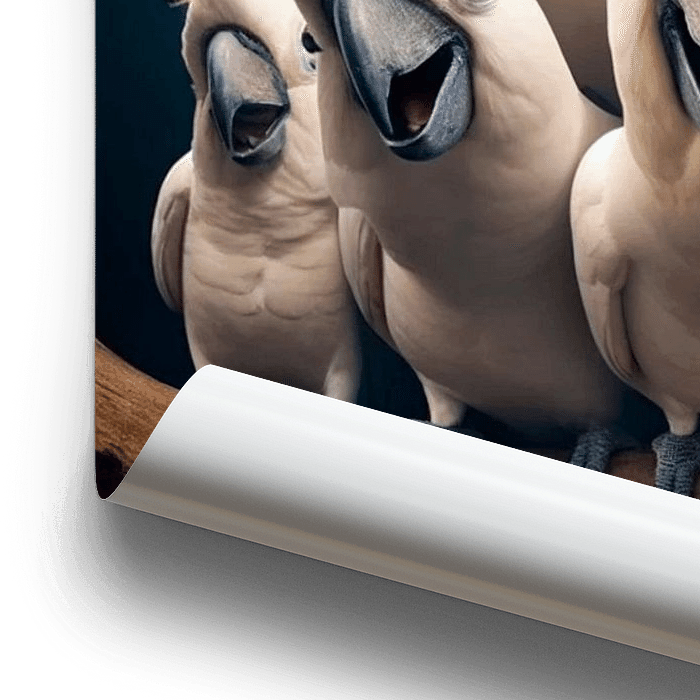 Dompel jezelf onder in een wereld vol charme, humor en dierenvreugde: deze digitale poster toont een groep vrolijke kaketoes die nieuwsgierig en met een ondeugende glimlach recht in de camera kijken. De scène wordt verlicht door een stralend licht van boven, dat werkt als een spotlight…