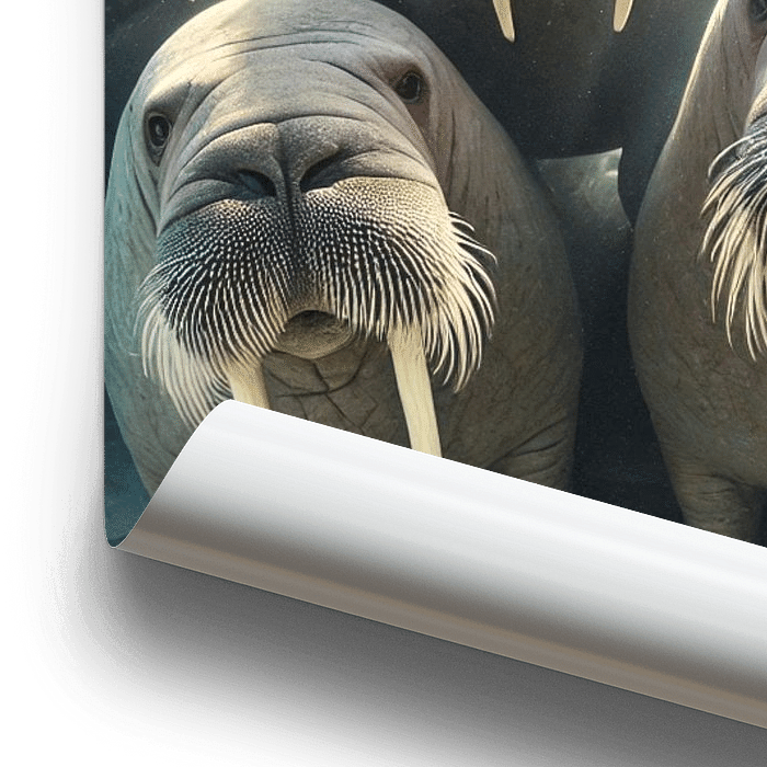 Deze indrukwekkende digitale poster toont een groep majestueuze walrussen onder water in een uniek perspectief. De scène wordt verlicht door schitterend zonlicht dat door het wateroppervlak breekt en de dieren een betoverende gloed geeft. De walrussen staan dicht bij elkaar en hun indrukwekkende slagtanden en gedetailleerde snorharen…