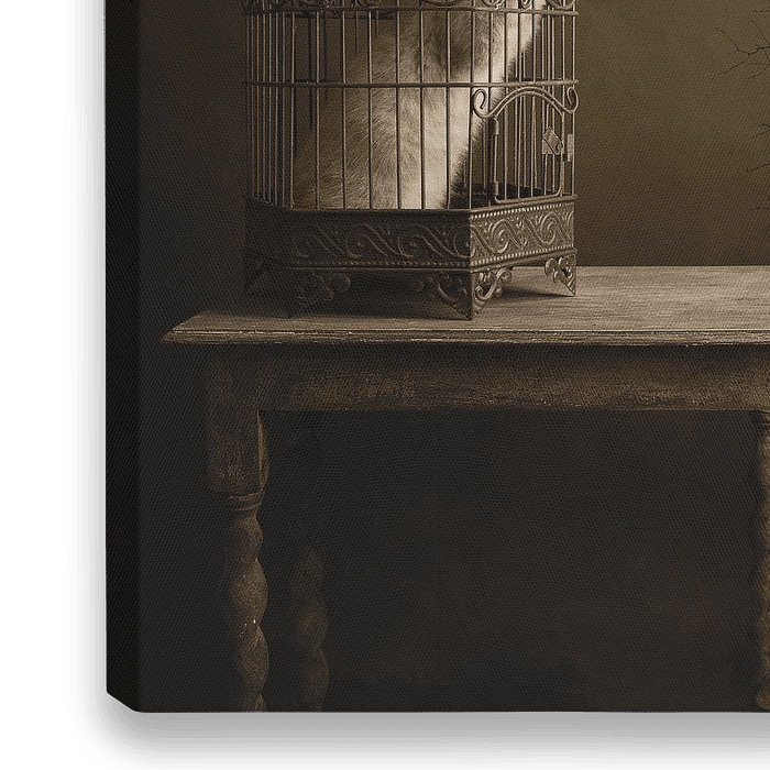 Guus de kat, opgesloten in een kooitje kijkt hij het vogeltje na