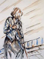 Aquarel/ Oost Indische inkt / Portret / Vrouw / Bezem/ Vegen /Schoonmaken / Haal de bezem erdoor/ Figuratieve kunst / Schilderkunst / Tekenkunst / Zwart / Bruin / Blauw/