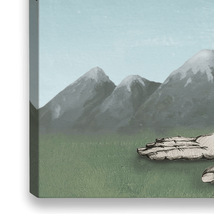Twee handen aan een arm staan in een berg landschap. Digitale collage van een potloodschets en een acryl verf landschap.