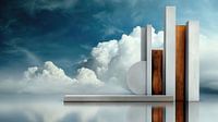 Tegen een oneindige horizon, gedomineerd door zachte wolken en een kristalheldere lucht, rijst een minimalistisch bouwwerk op, een combinatie van architectonische puurheid en artistieke abstractie. Enorme geometrische vormen - verticale kolommen in beton- en roesttinten - staan als monumenten van symmetrie op een spiegelglad…