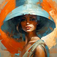 Kleurrijk en surrealistisch schilderij van een vrouw met hoed