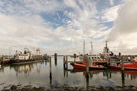 Foto van de haven in Terschelling. Op de foto zijn boten te zien, en havenpalen. Het water is glad, en boven de boten hangt een mooie wolken lucht. De foto is gemaakt in augustus 2023