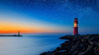 Haveningang met vuurtoren van Warnemünde bij nacht