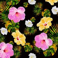 Watergekleurde bloemen en bladeren op een zwarte achtergrond.