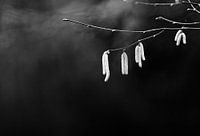 Hazelaarstak met mannelijke bloemen van de hazelaarstruik tegen een vage abstracte achtergrond