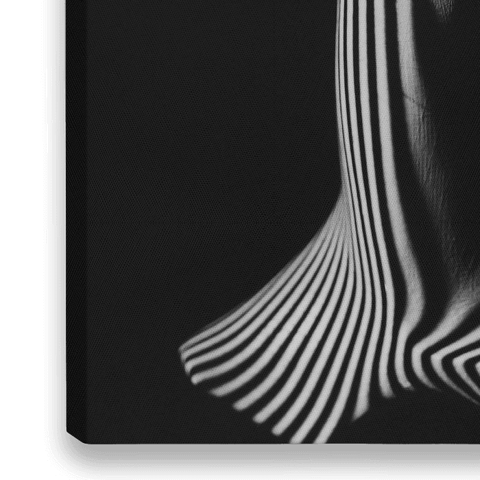 Een contrastrijk kunstwerk met het silhouet van een vrouw kunstig verlicht door opvallende, afwisselende strepen die een opvallend patroon op de huid creëren. De achtergrond is donker, waardoor de contouren van het gezicht worden benadrukt en het visuele spel van licht en schaduw wordt versterkt.