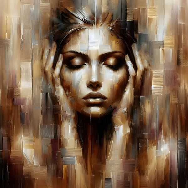 Ontdek de intrigerende expressie van stilte en mysterie in dit abstracte olieverfwerk van een vrouw met haar handen voor haar oren. In rijke bruin- en goudtinten wordt het eeuwenoude gezegde "horen, zien en zwijgen" op een meeslepende manier tot leven gebracht. Dit werk accentueert haar krachtige boodschap van introspectie en…