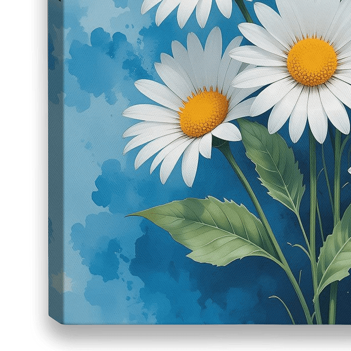 Een levendige en vrolijke afbeelding van een boeket madeliefjes met helderwitte bloemblaadjes en een zonnig geel hart tegen een zachtblauwe achtergrond.