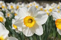 Close up van prachtige witte narcisbloem met gele trompet, omringd door andere witte narcissen. Een perfecte frisse, lentekunstprint.