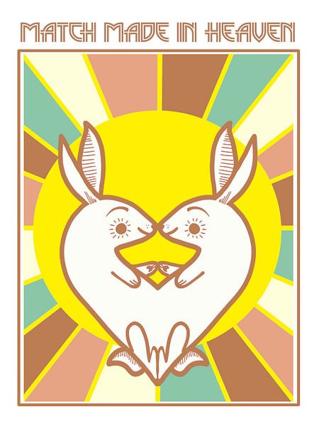 Laat je hart smelten met dit kunstwerk van twee verliefde konijnen: een charmante mix van vintage flair en speelse romantiek. De illustratie combineert subtiele pasteltinten en warme aardetinten met gestileerde lijnen en retro-patronen die doen denken aan illustraties uit…