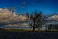 Terwijl er steeds meer dreigende wolken kwamen pikte de bomen op de achtergrond het zonlicht nog mee en showde hun mooie herfstkleuren. Deze foto heb ik gemaakt in Wieler, in mooi Limburg.