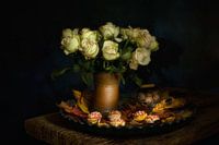 Herfst stilleven met rozen ,bladerende cupcakes als paddestoel . Brengt een artistieke warme sfeer in uw kamer .
