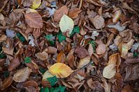 Een dicht tapijt van gevallen herfstbladeren in bruin, oranje en grijstinten bedekt de grond. Rijke texturen en natuurlijke kleuren roepen de sfeer van het seizoen op, met name voor de natuur of reizen