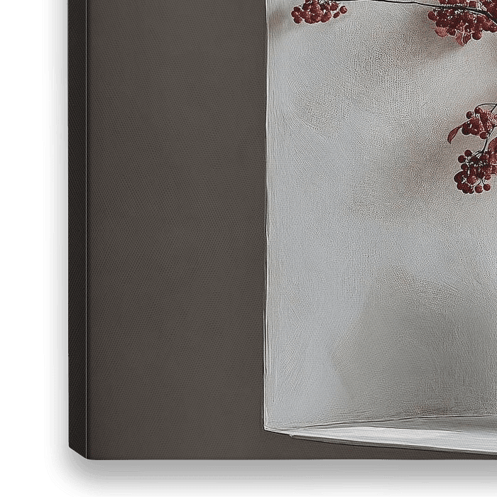 Een minimalistische compositie waarin een witte keramische vaas op een vensterbank staat, gevuld met sierlijke takken van rode bessen en goudkleurige herfstbladeren. Het zachte daglicht dat door het raam valt creëert een sereen spel van licht en schaduw, wat de warme herfsttinten prachtig accentueert tegen de witte achtergrond.