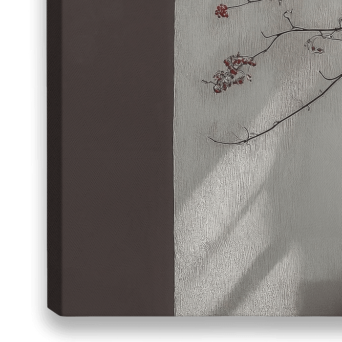 Een tijdloos stilleven waar een witte keramische vaas, geplaatst op een lichte vensterbank, de hoofdrol speelt. De fragiele takken met vuurrode bessen en goudkleurige herfstbladeren dansen tegen een minimalistische witte achtergrond, terwijl het zachte daglicht door het raam een subtiel schaduwspel creëert.