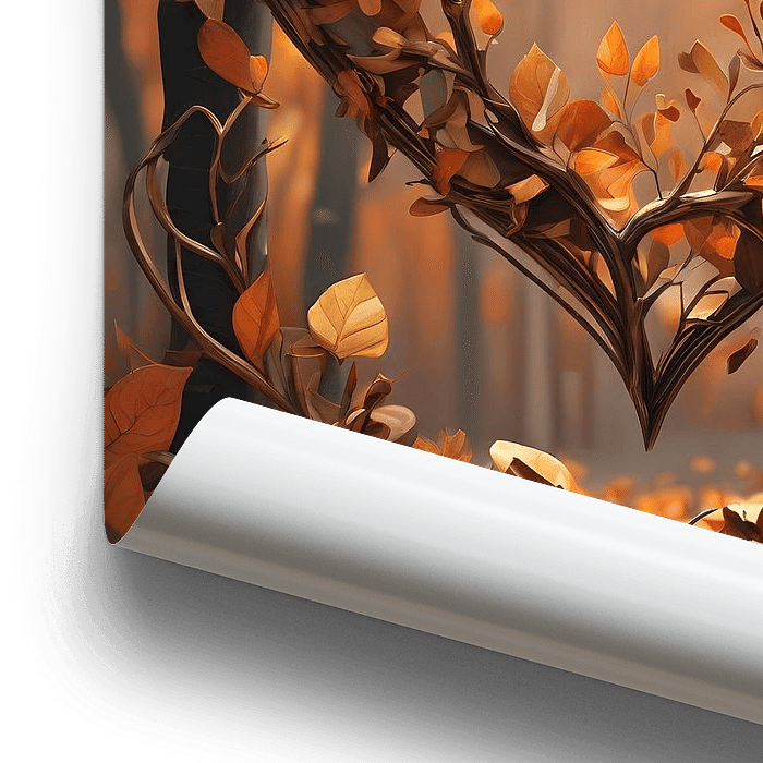 Deze afbeelding toont een herfstscène waarin takken en bladeren op een sierlijke manier een hartvorm vormen. De warme, oranje en bruine tinten van de bladeren geven een intieme en rustgevende sfeer, perfect voor een herfstdecor. De kunststijl bevat elementen van zowel naturalisme als surrealisme, met een sterke nadruk op details in de…