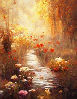 Een dromerig herfstlandschap waarin een slingerend riviertje wordt omringed door weelderige bloemen in warme tinten. Rode klaprozen en witte bloemen creëren een romantisch contrast tegen de gouden achtergrond van mistig ochtendlicht. De impressionistische stijl en warme kleurenpalet van oranje, rood en goud geven het werk een…