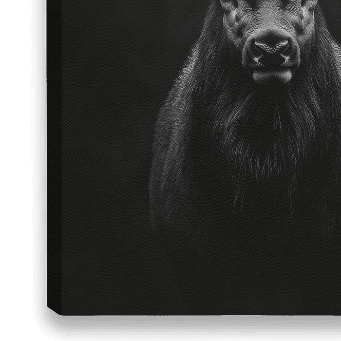 Een majestueus wezen dat de duisternis doorboort met zijn krachtige aanwezigheid en indrukwekkende gewei. Het monochrome decor versterkt het mystieke aura, terwijl de doordringende ogen direct boeiend zijn. Ideaal voor een moderne woonkamer of een stoere kantoormuur, het brengt zowel rust als kracht in elke kamer.