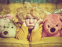 Een kind met krullend blond haar zit op een warme gele bank tussen twee grote pluche knuffels (wit en roze); nostalgische, zachtgetinte kinderfotografie.