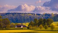 Een horizontale 16:9 foto met het laatste avondlicht in de lente met frisse groene kleuren over de velden van het Limburgse heuvellandschap in het zuiden van de provincie Limburg nabij het dorp Epen, gelegen tegen de Belgische grens.