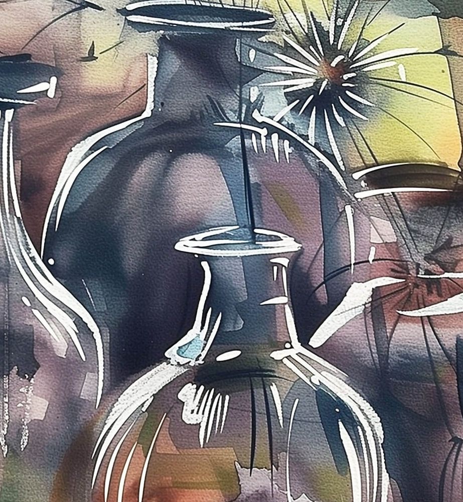 De weergave van licht en textuur in het schilderij kan wijzen op een zekere kwetsbaarheid, alsof de vazen elk moment kunnen bewegen of breken. Dit stuk lijkt de vergankelijkheid van het moment vast te leggen en nodigt de kijker uit om dieper te kijken en te reflecteren op de schoonheid van transparantie en licht.
