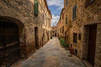 Smal straatje in het Toscaanse dorpje Castelmuzio in Italië. Het dorp ademt een authentieke verstilde sfeer met oude huizen en smalle straatjes. Het is nog niet ontdekt door veel toeristen en dus erg rustig. Waarschijnlijk omdat er geen musea en winkels zijn, met uitzondering van een supermarktje.