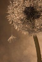 "Het afscheid: Tijd om te gaan!" is een macrofoto van een pluizenbol, waar een pluisje de bol verlaat. Op zowel de pluizenbol als het pluisje liggen waterdruppeltjes.