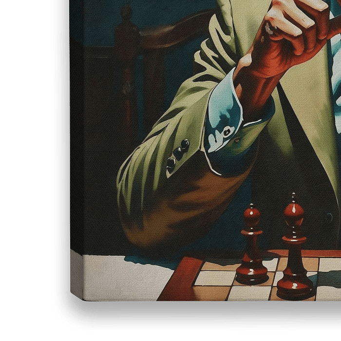 Het schilderij legt een moment van absolute intensiteit vast - een psychologisch duel ingekapseld in de blik van een schaker die zijn ogen op de kijker vestigt en hem uitdaagt zijn volgende zet te voorspellen. Het is een ongelooflijk kunstwerk dat je zal fascineren! De man zit in een weelderige, zacht verlichte kamer en draagt een strak, op maat gemaakt pak waardoor hij er krachtig en gezaghebbend uitziet. Eén hand rust zelfverzekerd op het gepolijste schaakbord, een enkele vinger wijst naar zijn volgende briljante zet! De andere hand zweeft erboven, klaar om de beslissende zet te doen die het spel zou kunnen beëindigen in een spectaculaire schaakmat! Zijn ogen zijn doordringend, berekend en onverbiddelijk - een portret van totale dominantie en focus! De spanning in zijn houding en uitdrukking is elektrisch en trekt de kijker het mentale slagveld op waar veel op het spel staat.