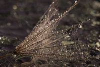 "Het gevallen pluisje" is een macro foto van een pluisje van een morgenster die op een waterig oppervlak ligt. Aan het pluisje hangen kleine waterdruppeltjes die schitteren in het licht.