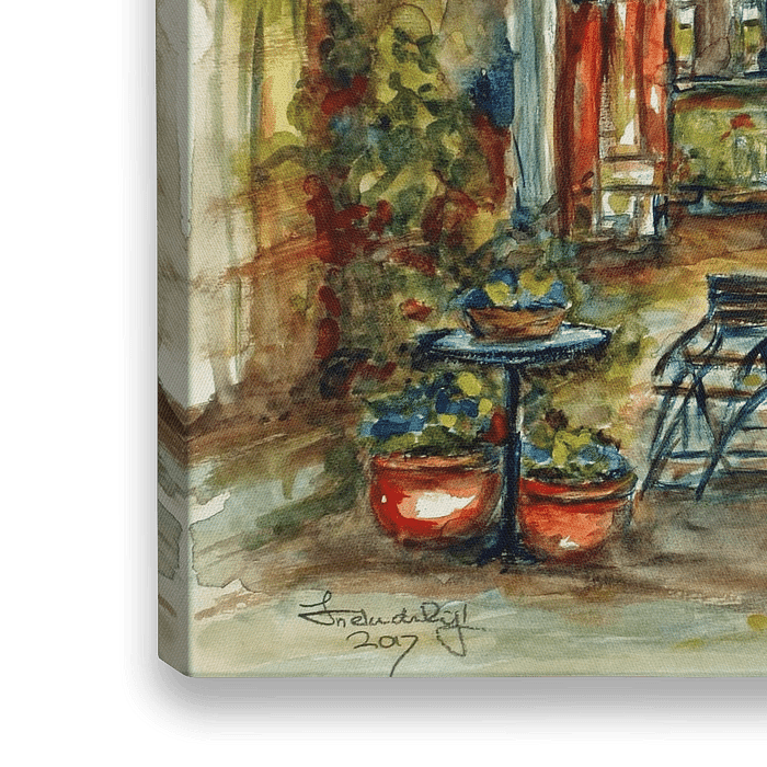 Een sfeervol herfstig straatje in Amsterdam met een klein cafeetje. De bomen verkleuren in gele en rood bruine tinten hier vastgelegd met aquarel. . Kleine cafeetje zijn meestal buurt cafés. Een café is de plaats waar mensen elkaar ontmoeten en waar het gezellig is. Een plek waar men elkaar kent en men bijpraat over de alledaagse dingen.