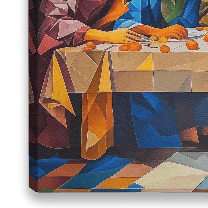 Het laatste avondmaal kubisme kleurrijk panorama in een moderne, kubistische panorama-uitvoering. Dit schilderij is een ware blikvanger: een eigentijdse interpretatie van het iconische tafereel, weergegeven in een stijl die barst van expressie, vorm en kleur.