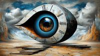 Midden in een eindeloos, ruig woestijnlandschap staat een monumentale, surrealistische sculptuur die het middelpunt van de belangstelling vormt in een verder verlaten wereld. Het werk toont een oversized oog ingebed in een mechanische structuur die doet denken aan een antieke klok. Romeinse cijfers omlijsten het oog, terwijl het…