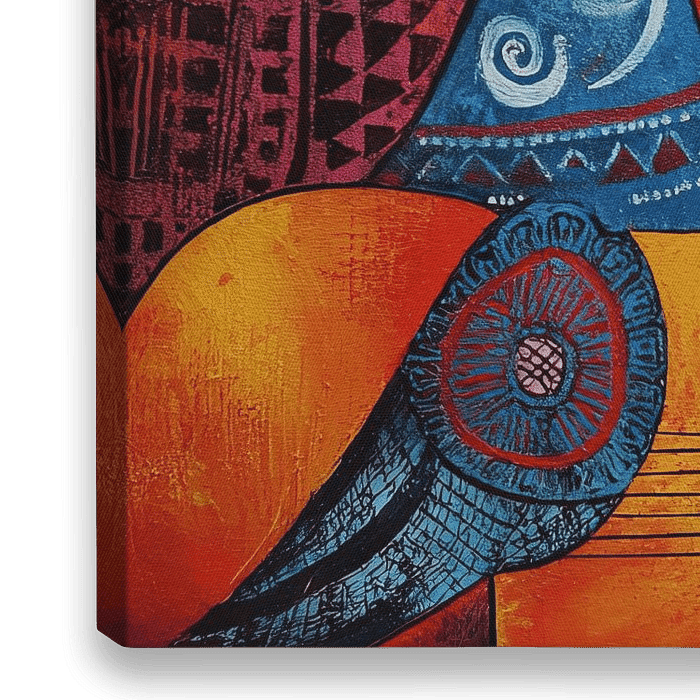 Hey mama | Vrolijke Vogels | Colorful Bird Guitar Duo - Kleurrijk schilderij met twee vrolijke vogels - de een, stoer en zelfverzekerd, brengt een serenade aan zijn lief. Zij is niet snel onder de indruk (maar vindt het stiekem wel leuk). Met levendige patronen en een speelse uitstraling die de moderniteit van de kunst…