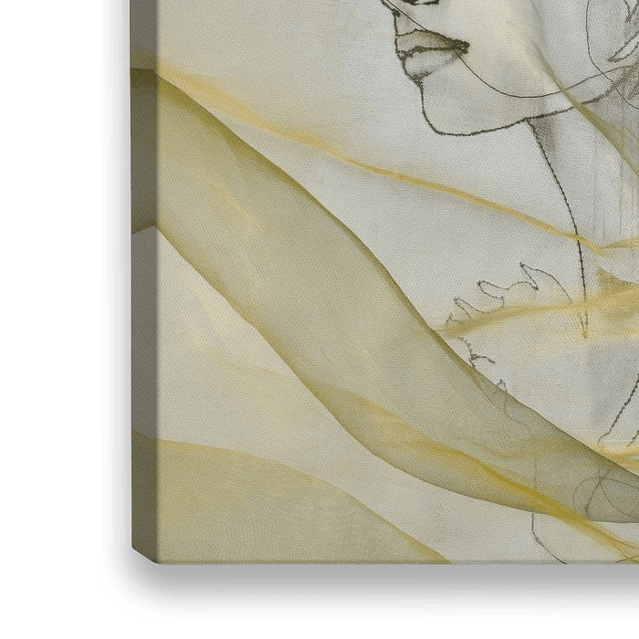 Een dubbellaags figuratief werk van draad, houtskool, acryl, krijt en voile.