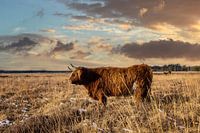 Schotse Highlanders op de heide in mooi rood avondlicht en met wolken en avondlicht in het beeld een grazende koe op de voorgrond.