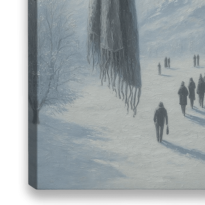 Op de achtergrond loopt een rij kleine, afgeplatte menselijke silhouetten richting de verte — een groep mensen die door het winterlandschap schuifelt. Ze zijn klein, donker en lopen met lange schaduwen over het sneeuwveld; ze geven schaal aan de zwevende sjaal en hoed en zetten een zachte beweging in het beeld. De kale bomen en de blauw-witte bergen in de verte vullen het landschap aan tot een sereen sneeuwlandschap schilderij met een feestelijke, licht ironische kerstrand. Door de compositie leidt het oog van de zwevende figuur naar de menselijke stoet beneden, en weer terug, alsofheteenstilleparadeis.