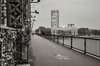 Duizenden hangsloten op de Hohenzollernbrücke . Een avondbeeld van voetgangers op de brug in Keulen aan de Rijn . Een ietwat groezelig monochroom straatbeeld