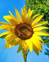 Midzomer: een zonnebloem in volle glorie wordt bezocht door een hommel, onder een staalblauwe hemel en groene boom.