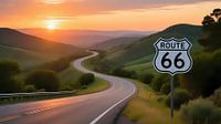 De foto toont een deel van de historische Route 66 in een feitelijke weergave: een tweebaans, geasfalteerde landweg met een duidelijke, witte middenstreep en contrasterende randmarkeringen die zich recht in de verte uitstrekt. Rechts en links liggen vlakke, droge vlaktes met lage begroeiing, verspreide struiken en zandgrond; de…
