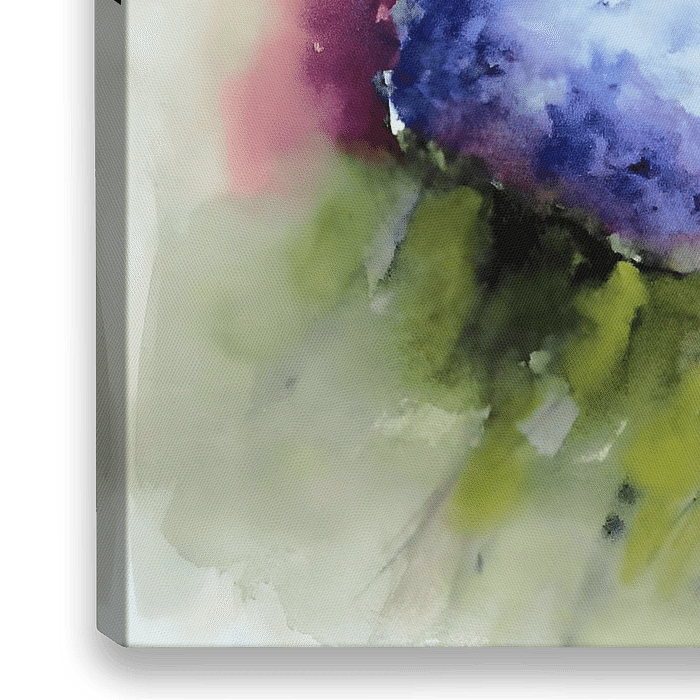 Deze aquarel straalt een zachte, dromerige sfeer uit en vangt de essentie van natuurlijke schoonheid. De kunstenaar heeft met delicate penseelstreken een trio van hortensiabloemen gecreëerd, elk in een unieke kleur: zacht roze, levendig paars en fris wit. De bloemen lijken haast te zweven in een abstracte omgeving, omringd door subtiele…