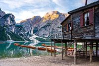 Houten boten langs de oever van de Pragser Wildsee, het Braies-meer, in de prachtige Dolomieten van Zuid-Tirol, Italië